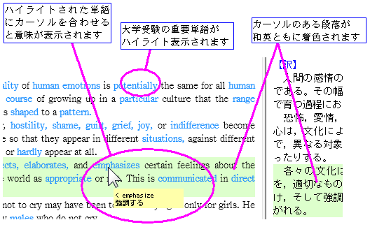 東京凰籃学院提供の重要英単語データベースをもとに,英文中の重要単語が ハイライト表示されます。